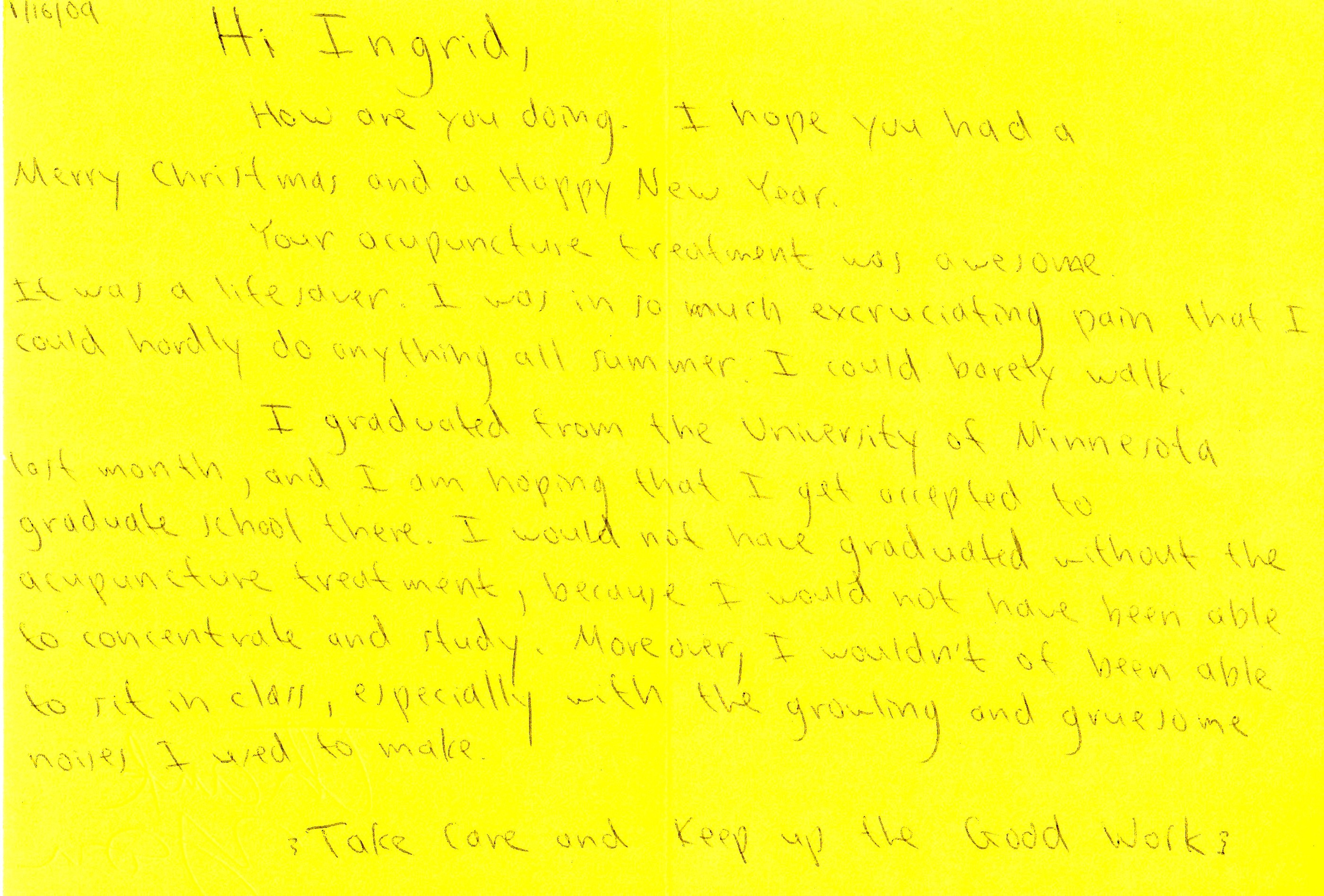 ....."I would not have graduated without the acupuncture treatment, because I would not have been able to concentrate and study. Moreover, I wouldn't of been able to sit in class, especially with the growling and gruesome noises I had to make".....Anonymous, Jan. 2009